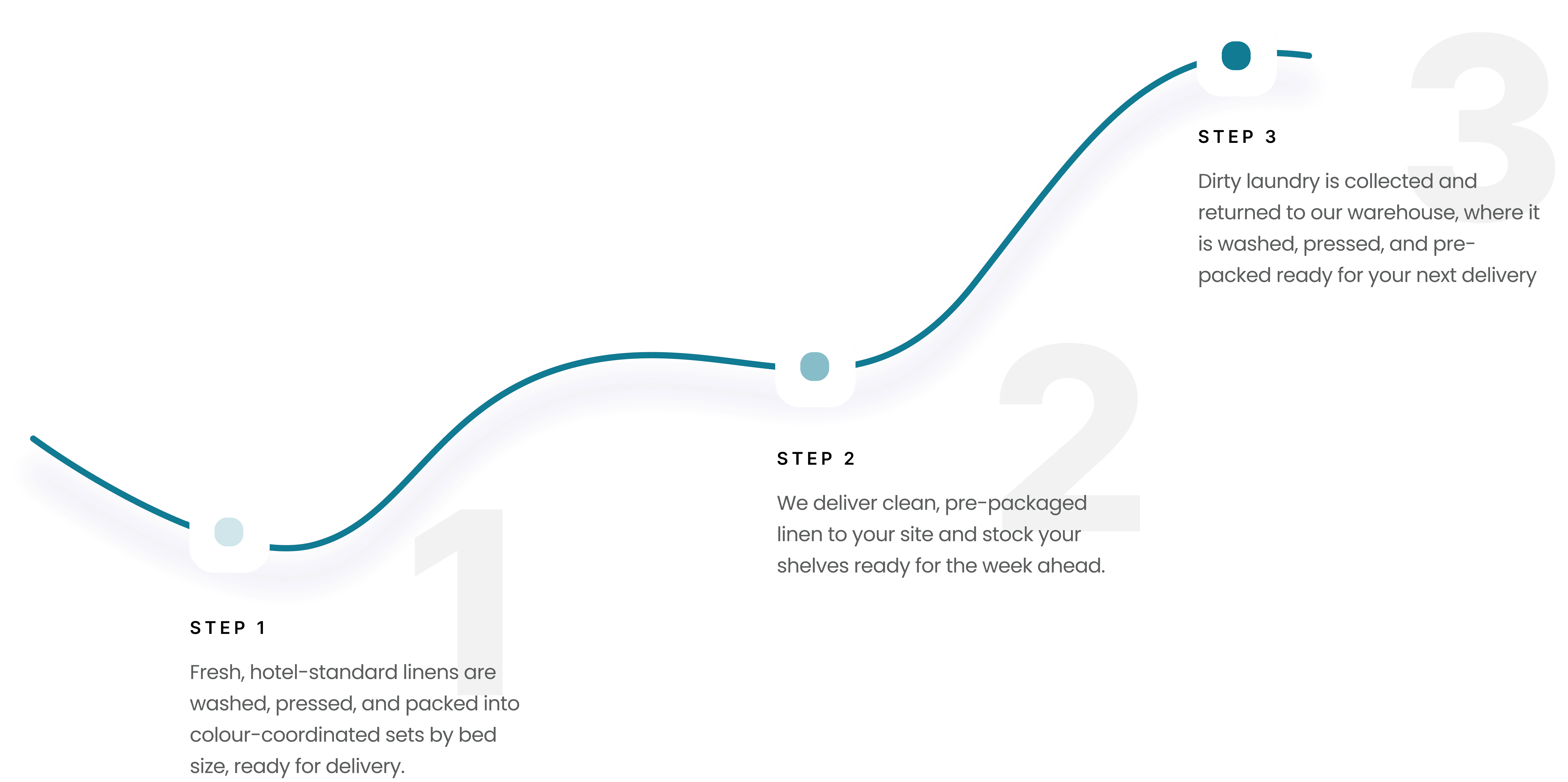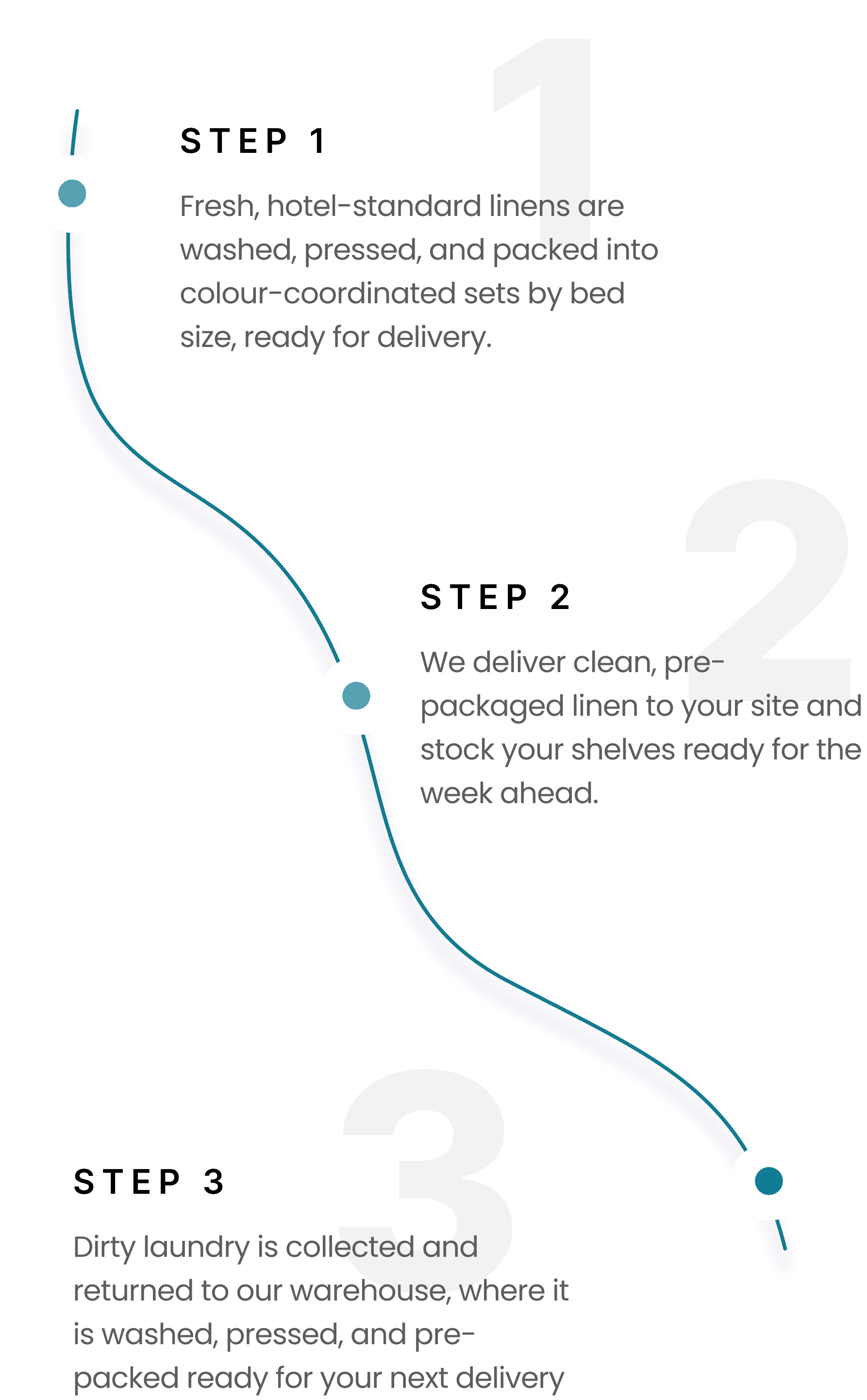 Pre-packed linen sets are delivered to you weekly, ensuring cleaning, stock management, and day-to-day operations run smoothly.